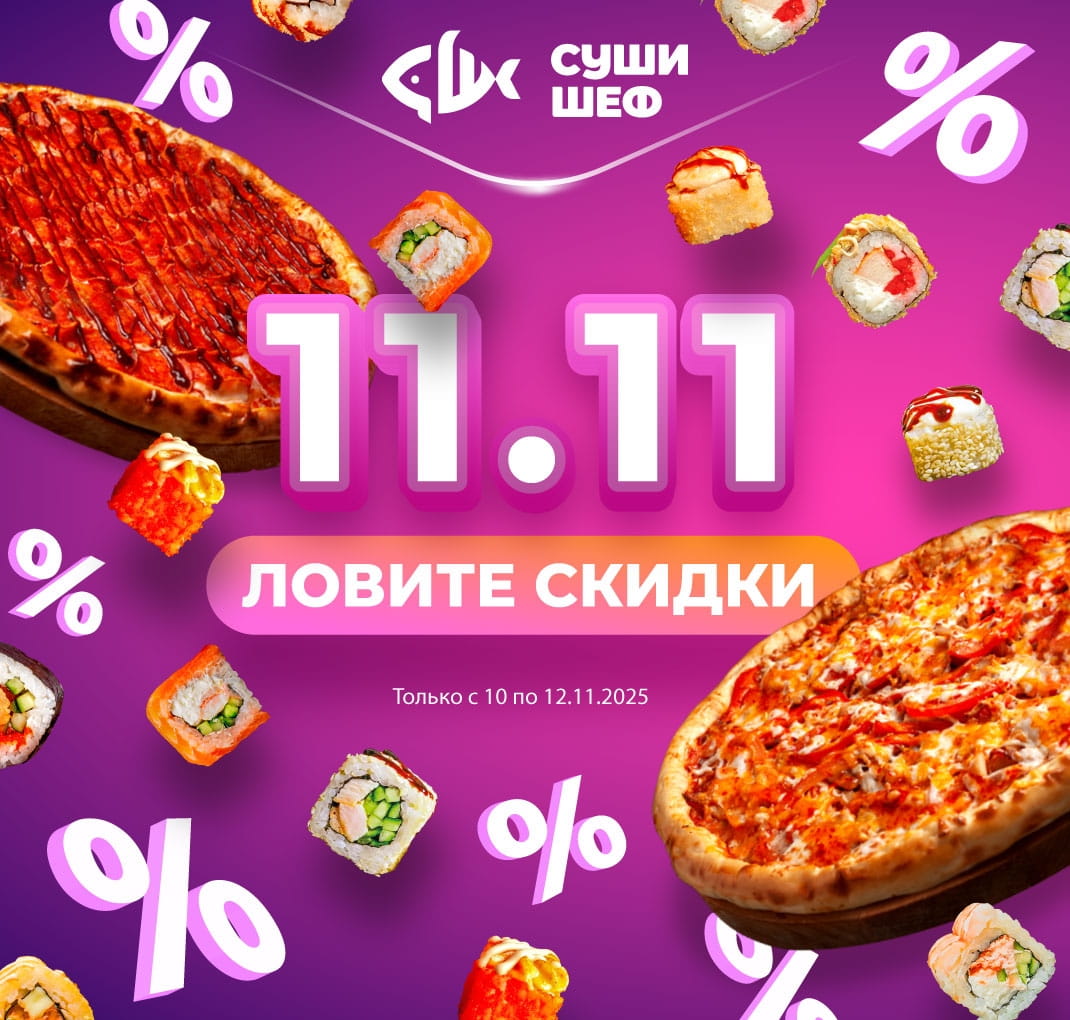 Скидка 11% спрятана в меню! Найдите выбранные роллы, пиццы и закуски по выгодной цене.